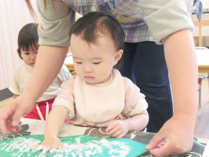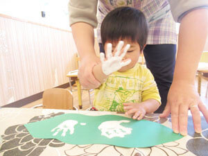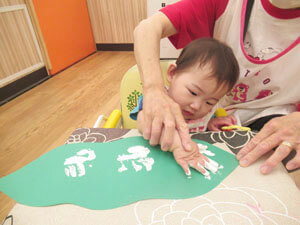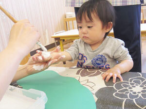 手の平全体に絵の具を付けるので、絵の具に慣れていない0歳児はびっくりしてしまうかと思いましたが、白い絵の具が画用紙の緑に映えて模様になるのが面白かったようで自分の手を見つめながら楽しそうに作ることができました。