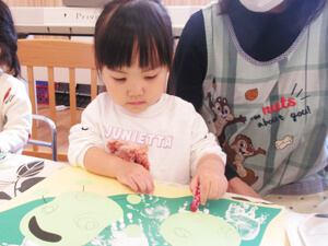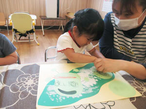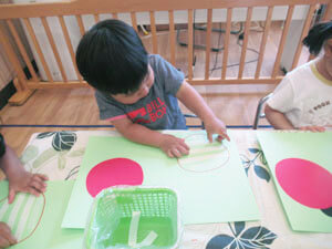 2歳児もはじめのうちは先生に「何回も押していいの?」と確認する子がいるくらい繰り返し押して良いのか躊躇していましたが、やって良いことが分かると嬉しそうに何度も手に絵の具を塗って模様を作りました。