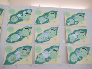 さやの中にあるふかふかのベッドのような白い部分を手の平に絵の具を付けて表現しました。