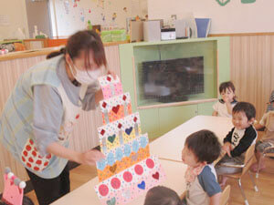 その月ごとに違った出し物を先生たちで用意していますが、今月は折りたたみ式のバースデーケーキを作りました。