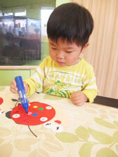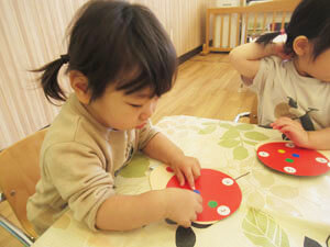 2歳児クラスではよりたくさん指先を使う遊びを取り入れていこうと思い、ちょうど旬を迎えたいちごとお散歩途中でよく見かけるテントウムシの2つを制作しました。