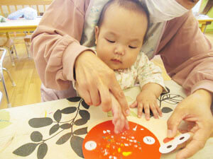 0歳児は時計の周りに指スタンプで模様を描き、1歳児はシールを貼りました。