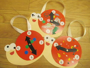 「はい、おやつのじかん、ねるじかん」とお話しながら針を動かして楽しみました。(おやつの時間が3時を指していなかったりするのですけれどね‥。それはご愛嬌です。)