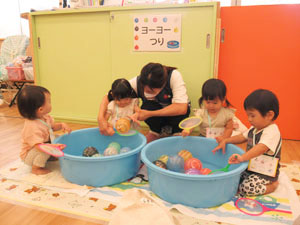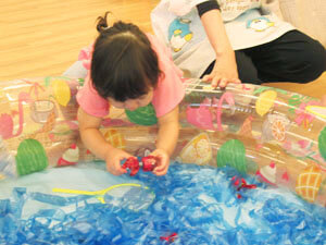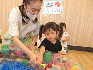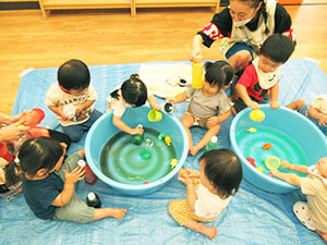 プールの中の金魚は先月みんなで作りました。作ったことを思い出して思わず手で捕まえて確かめてみる子も‥。