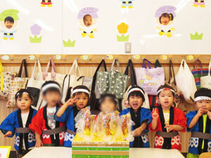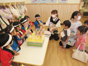 何日も前から楽しみにしていた縁日ごっこの日がやってきました。子どもたちにはひとりひとりにスタンプカードを渡します。