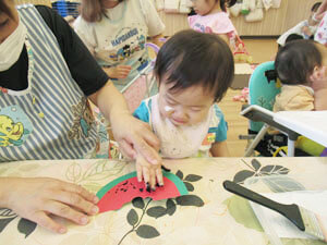 1歳児はペンギンのお腹はクレヨンで描き、スイカの種は0歳児と同じく指スタンプで行いました。