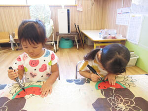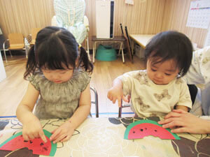 2歳児はちぎり絵に挑戦しました。台紙に描かれた果物に色紙を貼っていきます。